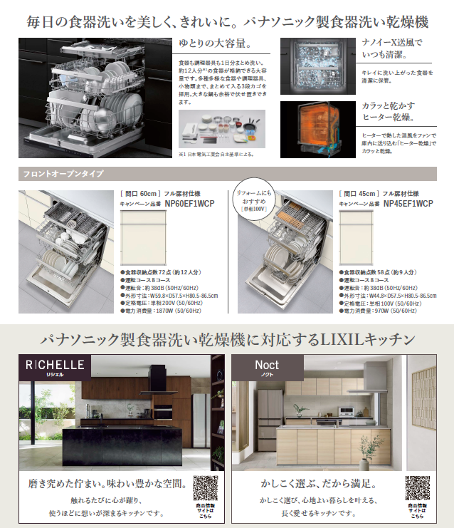 システムキッチン「リシェル」または「ノクト」 と パナソニック製食器洗い乾燥機 フロントオープンタイプをセットでご成約いただいた方