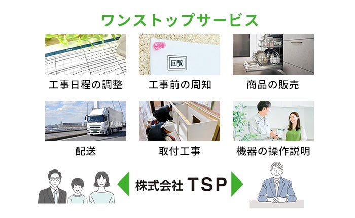 TSPなら、商品の販売から配送、取付工事までワンストップで対応できます。それだけでなく、入居者様との日程調整や機器の操作説明、近隣住人への工事の周知など、煩雑な作業をお客様の代わりに対応いたします。